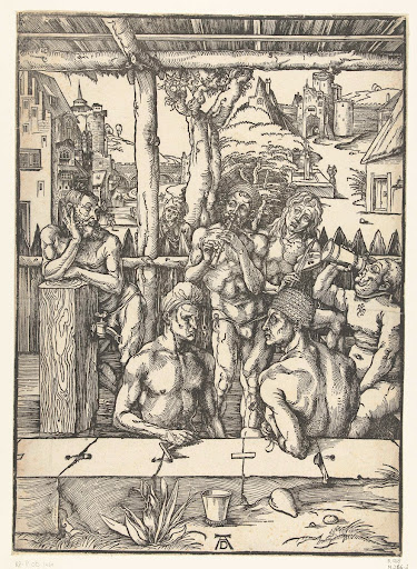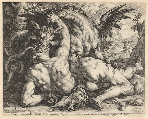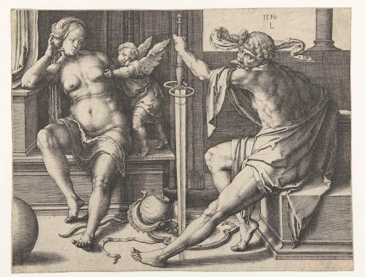 Goltzius ontleende de linkerarm en hand van de voorgrondfiguur aan Michelangelo’s beeld van de Dag op het graf van Giuliano de’ Medici. Zijn rugpartij is e...